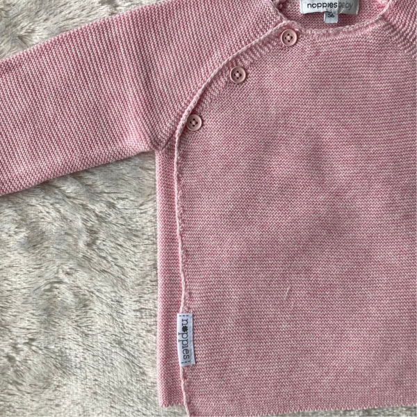 Een schattig licht roze melange vestje met een overslagsluiting van het merk Noppies in maatje 56.