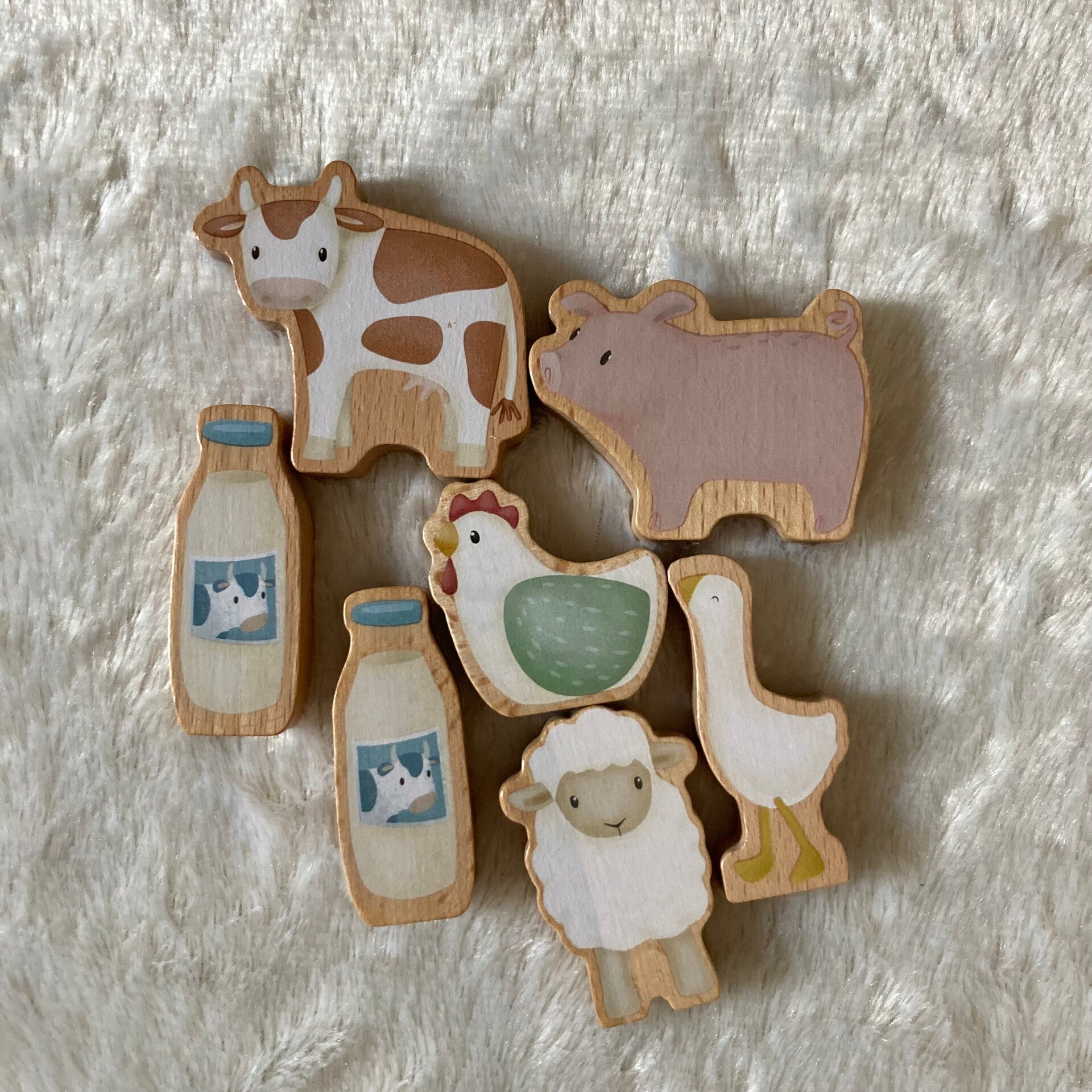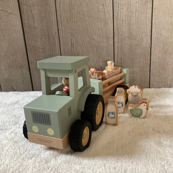 Vroem vroem, hier komt de tractor met alle diertjes aan! Super leuk speelgoed om de fantasie van jouw kleine te stimuleren. Naast de diertjes vind je ook twee melkflessen in de aanhangwagen. Breng alles naar de boerderij en je taak is voldaan. Alles is gemaakt van hout, waardoor het lang mee kan gaan.