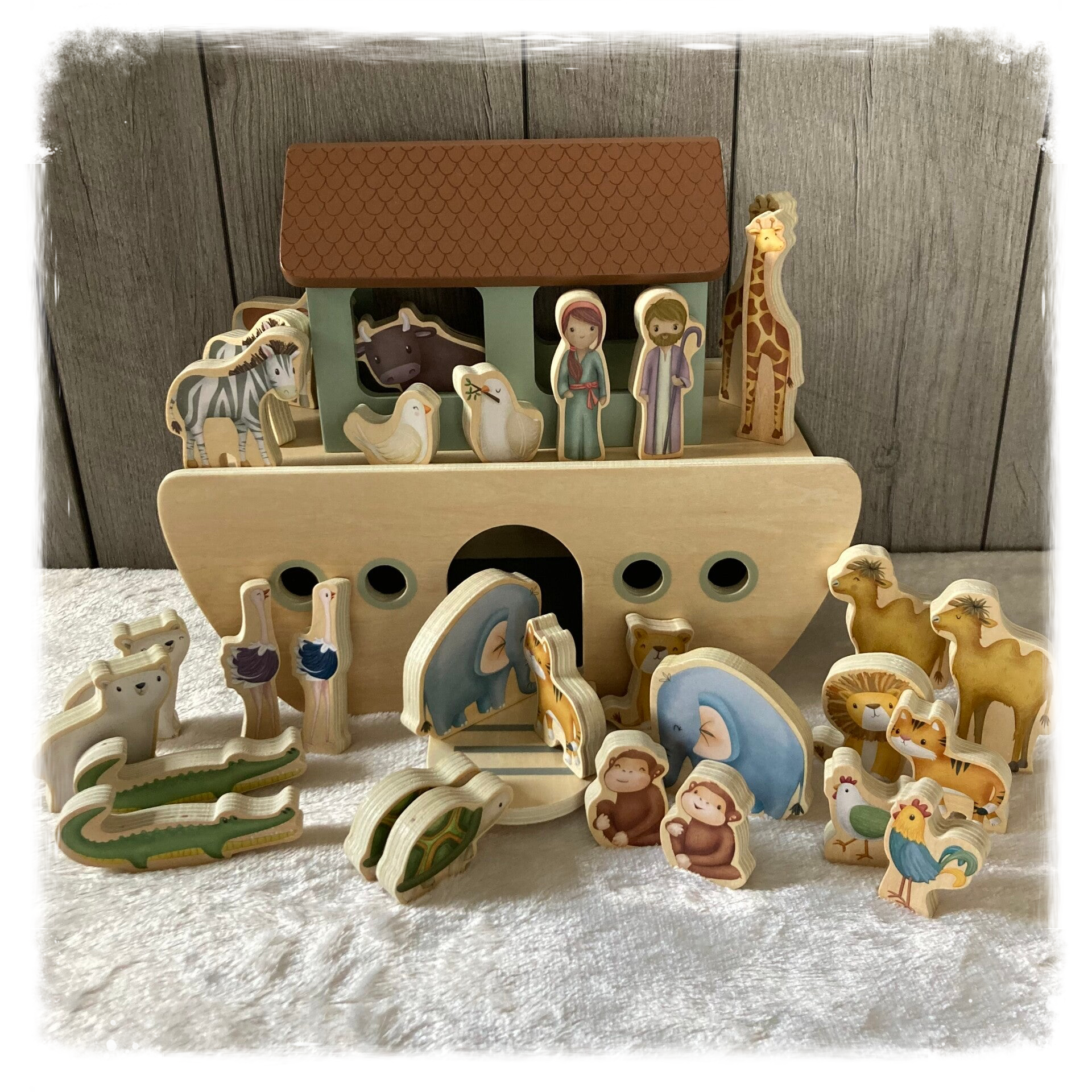 Deze 31-delige set bevat de Ark met een deur, een dek dat omhoog kan worden gelift om alle dieren aan boord te brengen: