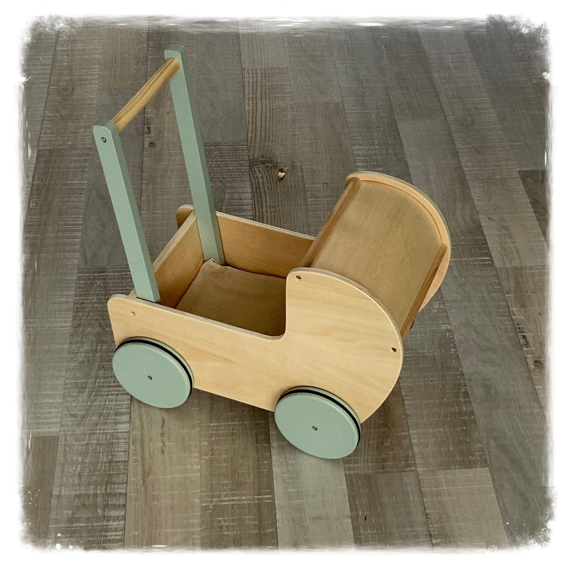 Een houten poppenwagen met handvat en wielen in stoffig groen. Een lakentje en een kussen in gebroken wit katoen zijn inbegrepen. Een klassiek ontwerp van een kinderwagen dat rollenspel met poppen en knuffels aanmoedigt. De wielen zijn voorzien van rubber, wat betekent dat het geluid wordt gedempt als de kinderwagen over de grond rolt en het maakt de kinderwagen ook stabiel. De wandelwagen is ook een leuke aanvulling als het kind zijn eerste stapjes oefent.
