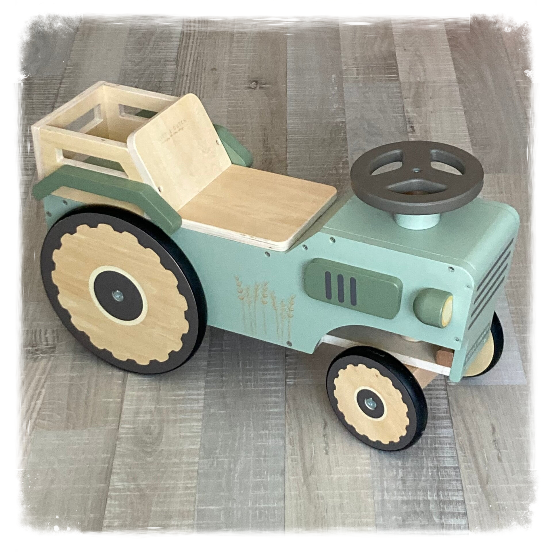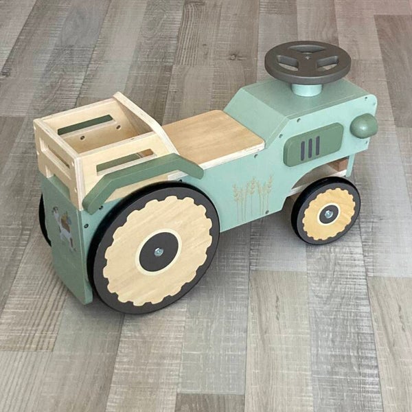 Start je tractor en ontdek de het leven op de boerderij. Stap voor stap leer je lopen en deze houten looptractor zal je daarbij helpen. Stel je voor dat je je eigen boerderij hebt, met kippen en geitjes, waar je gewassen verbouwt, terwijl je de hele dag op je eigen tractor rijdt. De looptractor met 4 wielen bevorderd de motoriek en het evenwicht. Je kindje kan zittend op de tractor rijden en zich vasthouden aan het stuur, of het gebruiken als stabiliteitssteun voor de eerste stapjes. Het laadbakje aan de achterkant van de tractor biedt een handige ruimte om favoriet speelgoed te verzamelen en op te bergen. Of het nu gaat om kleine pluchen dieren, bouwblokken of andere speeltjes, het leert je kleintje op een speelse manier te organiseren en de verbeelding te gebruiken. Dankzij de rubberen strips op de wielen hoef je je geen zorgen te maken over je vloer wanneer je kindje op avontuur gaat.