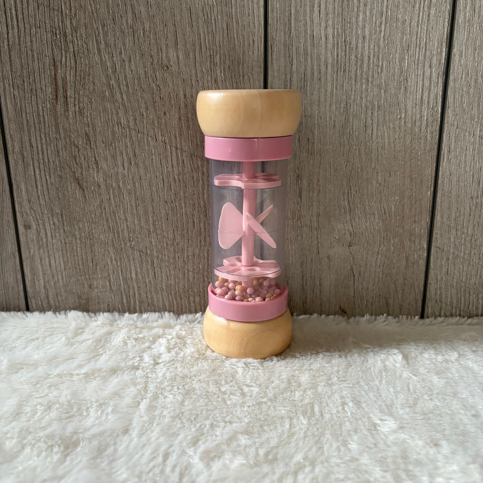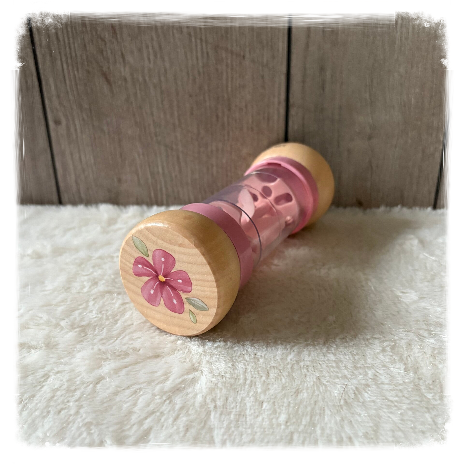Schud en rammel! Draai de regenrammelaar om en luister naar de rustgevende druppelgeluidjes van de balletjes die van de ene naar de andere kant van de regenmaker bewegen. Het stimuleert de zintuiglijke ontwikkeling en het muzikale talent van je baby. De balletjes, vallen door kleine openingen in de buis en laten de propeller draaien, wat resulteert in een aangenaam geluid. De regenrammelaar is ontworpen voor kleine handjes en ligt lekker in de hand. De houten boven- en onderkant zijn versierd met een illustratie van een bloem en een vlinder