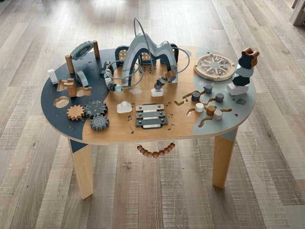Wat een fijne ontdekkingstafel is dit! De houten activiteitentafel van Label Label in een stijlvolle blauwe kleur is speciaal ontworpen voor nieuwsgierige dreumesjes. Boordevol interactieve elementen die je kindje spelenderwijs uitdagen om te grijpen, draaien, schuiven en sorteren!