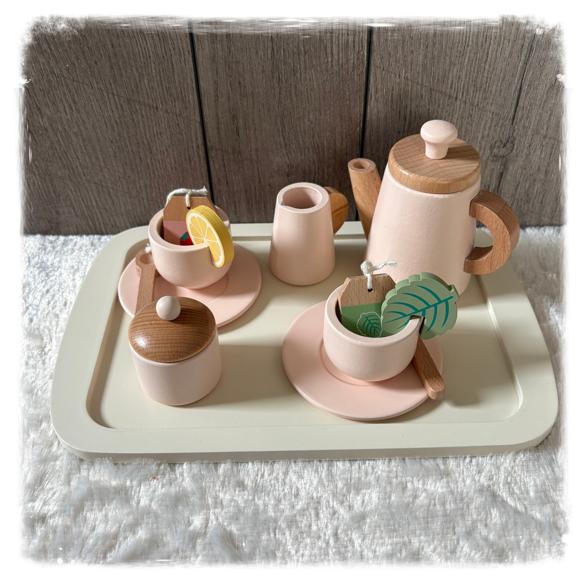 Het houten theeservies voor kinderen bevat alles wat nodig is voor een gezellig theekransje: een theepot met deksel, twee kopjes met bijpassende schoteltjes, een melkkan, een suikerpot met deksel, twee lepeltjes, twee houten theezakjes met illustraties, een schijfje citroen, een muntblaadje en een bijpassend dienblad. Tijdens het schenken en serveren oefenen kinderen spelenderwijs hun fijne motoriek, creativiteit en sociale vaardigheden.