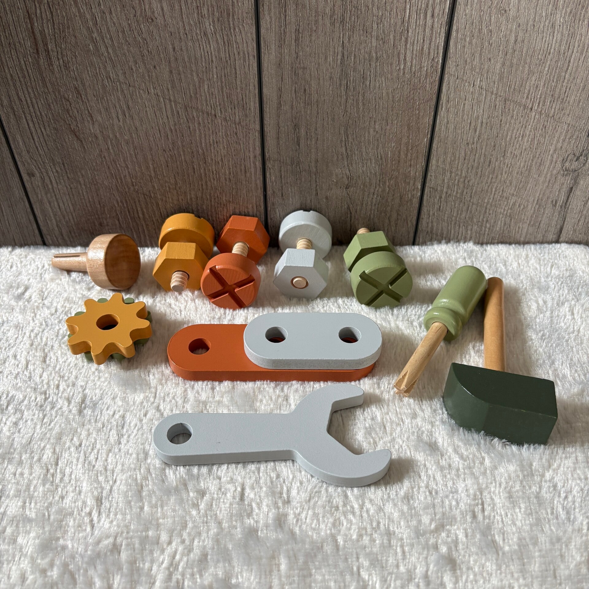 De houten speelgoed gereedschapskist bevat verschillende gereedschappen en onderdelen, zoals een hamer, steeksleutel, schroevendraaier, bouten, moeren, tandwielen en houten verbindingsplaatjes. Kinderen kunnen hiermee eindeloos bouwen, onderdelen vastdraaien en hun eigen constructies maken. Zo leren ze spelenderwijs hoe gereedschap werkt en ontwikkelen ze belangrijke vaardigheden.