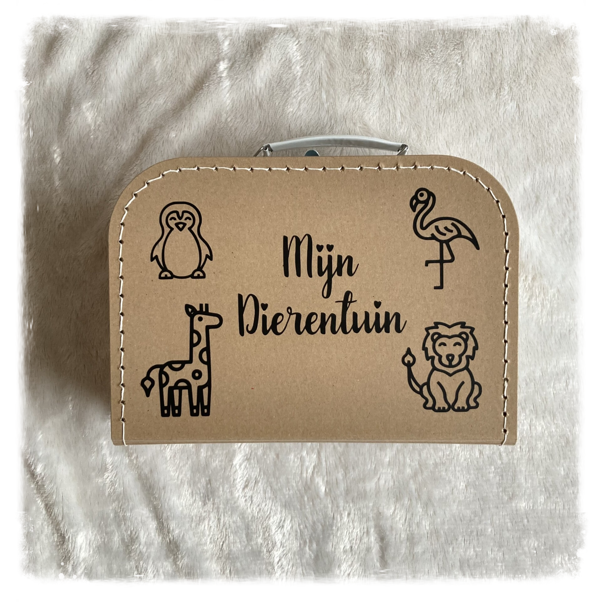 Een bedrukt kraft koffertje. De naam van het kindje kan er ook nog opget worden.