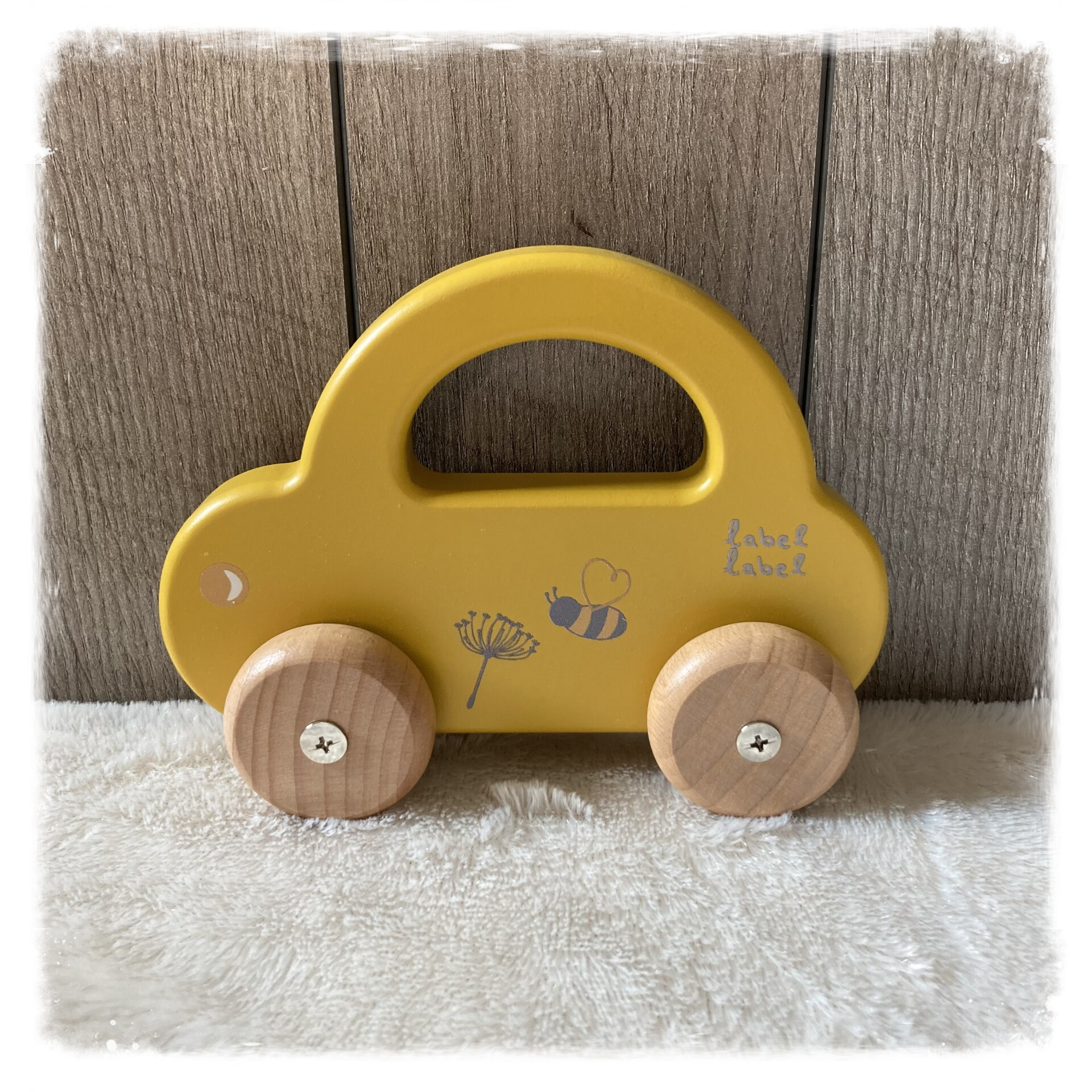 Een kleine houten auto van Label Label. Als je het leuk vind, kunnen we de naam van het kindje op de auto zetten.