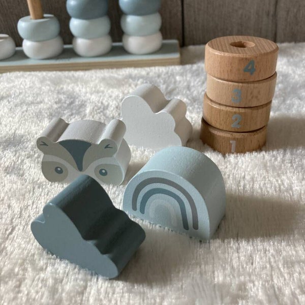 Deze super leuke Label Label houten stapelringen in mooie blauwe pastelkleurtjes met verschillende diertjes en vormen zorgt voor uren speelplezier.