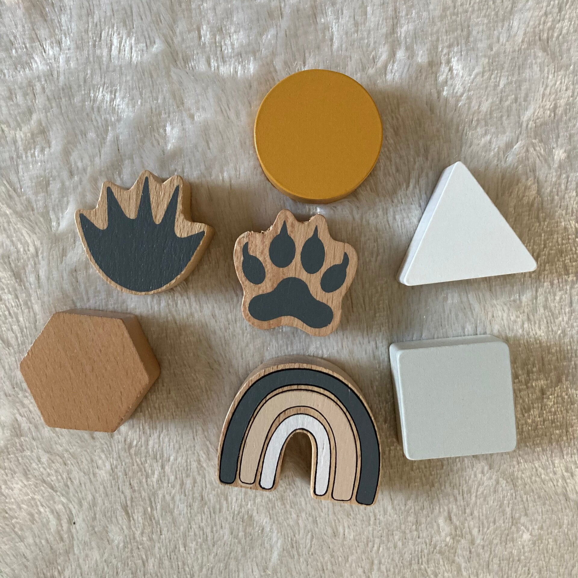 Plaats de juiste voetafdrukken van de leeuw en krokodil bij het juiste diertje met deze houten vormenstoof van Tryco! Daarna mogen ook de andere vormpjes in de juiste opening gestopt worden.