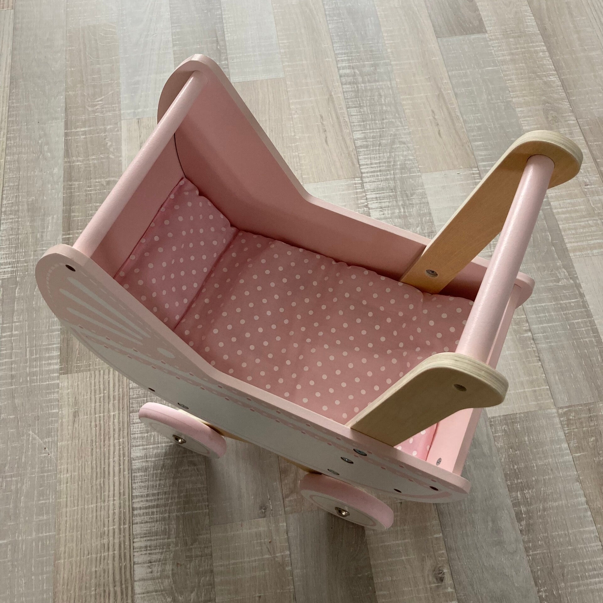 Spelen is niet alleen leuk, het is ook ontzettend belangrijk. Spelenderwijs leren kinderen de wereld kennen. Wat dacht je van dit schattige poppenwagentje. Gekruiste pootjes en een lief roze gestippeld dekje erin.