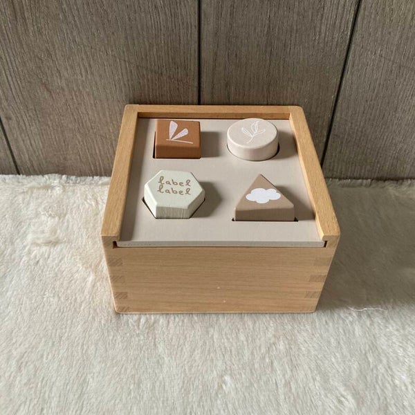 De blokkendoos heeft verschillende openingen waar de vormpjes in geduwd moeten worden. De vormpjes hebben ook een leuk print figuurtje.