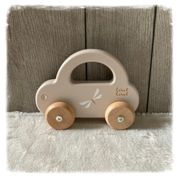 Een kleine houten auto van Label Label. Als je het leuk vind, kunnen we de naam van het kindje op de auto zetten.