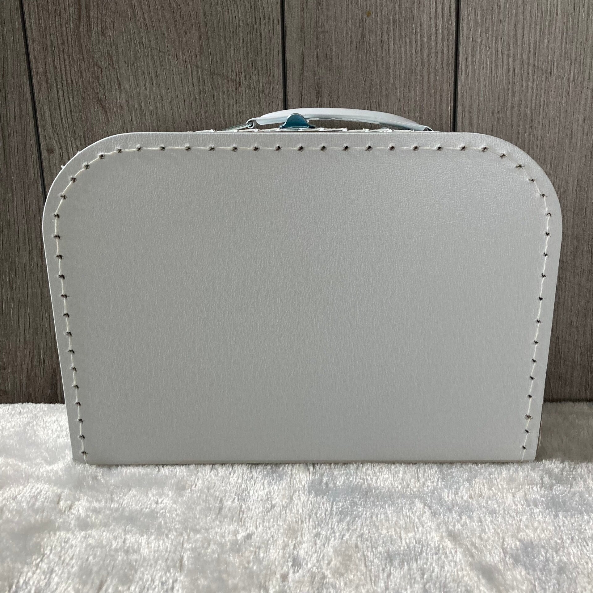 Koffertje met wit handvat en wit stiksel.